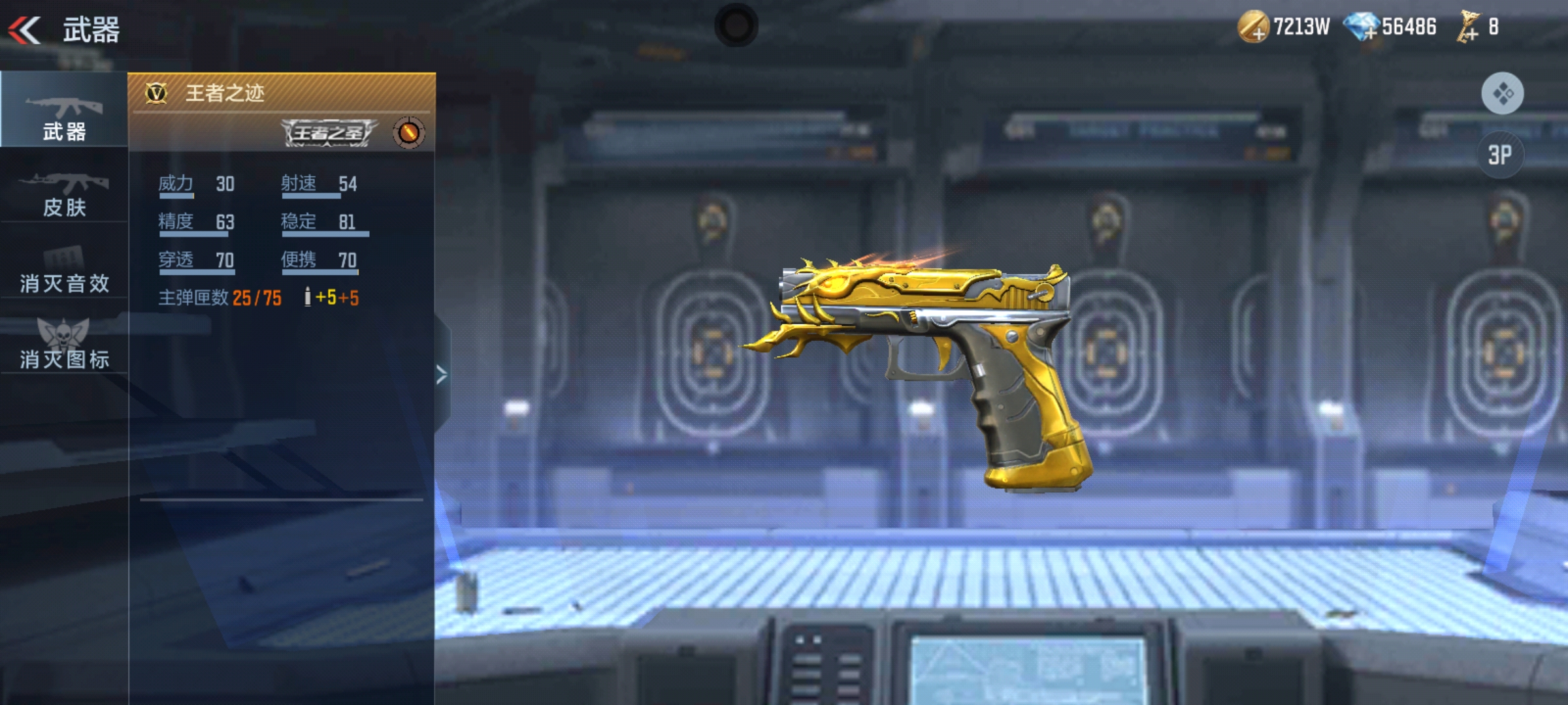 王者之迹是GLOCK18-武圣的升级版,枪身外观由一层金黄色铠甲包裹,顶端符文的雕刻彰显出其神秘色彩。枪身上金色流光闪动,为其提供绵绵不断的力量。握把的设计让使用者有更强的握力来控制抖动的枪身,使其拥有极高的精准度和稳定性。